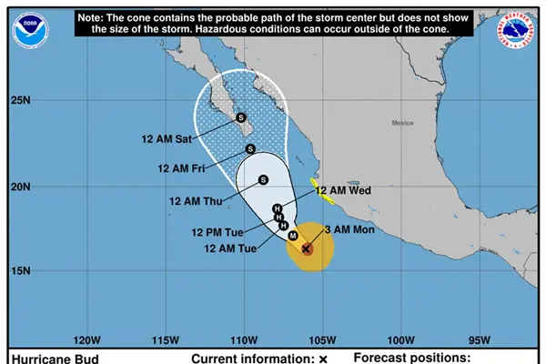 Añadió que el huracán Bud tiene desplazamiento al noroeste a 17 kilómetros por hora.