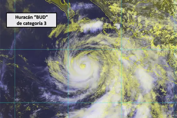 Ciudad de México.- A las 16:00 horas, tiempo del centro de México, el huracán Bud, categoría 3 en la escala de Saffir-Simpson, se localizó aproximadamente a 365 kilómetros (km) al oeste-suroeste de Cabo Corrientes, Jalisco, y a 495 km al sur-sureste de Cabo San Lucas, Baja California Sur, con vientos máximos sostenidos de 185 kilómetros por hora (km/h), rachas de 220 km/h y desplazamiento al noroeste a 6 km/h, informó el Servicio Meteorológico Nacional (SMN), dependiente de la Comisión Nacional del Agua (Conagua).