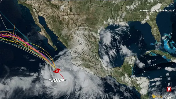 Ciudad de México.- A las 10:00 horas, tiempo del centro de México, John se incrementó a huracán categoría 2 en escala de Saffir-Simpson, con vientos máximos sostenidos de 165 kilómetros por hora (km/h), rachas de 205 km/h y desplazamiento al noroeste a 15 km/h; sus bandas nubosas absorbieron al ciclón tropical Ileana, por el efecto binario Fujiwhara, informó el Servicio Meteorológico Nacional (SMN), dependiente de la Comisión Nacional del Agua (Conagua).