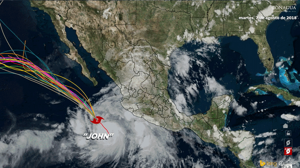 John se localizó a 510 kilómetros (km) al oeste-suroeste de Cabo Corrientes, Jalisco, y a 555 km al sur de Cabo San Lucas, Baja California Sur, y genera tormentas muy fuertes en regiones de Baja California Sur, Sinaloa, Nayarit, Jalisco, Colima y Michoacán.