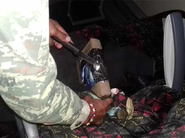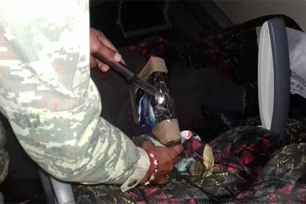 Se estableció que al bajarse los pasajeros, personal militar subió al autobús y al revisar entre los asientos número 11 y 12, localizaron un paquete envuelto con cinta canela, mismo que al revisar encontraron cocaína, que arrojó un peso de 890 gramos.