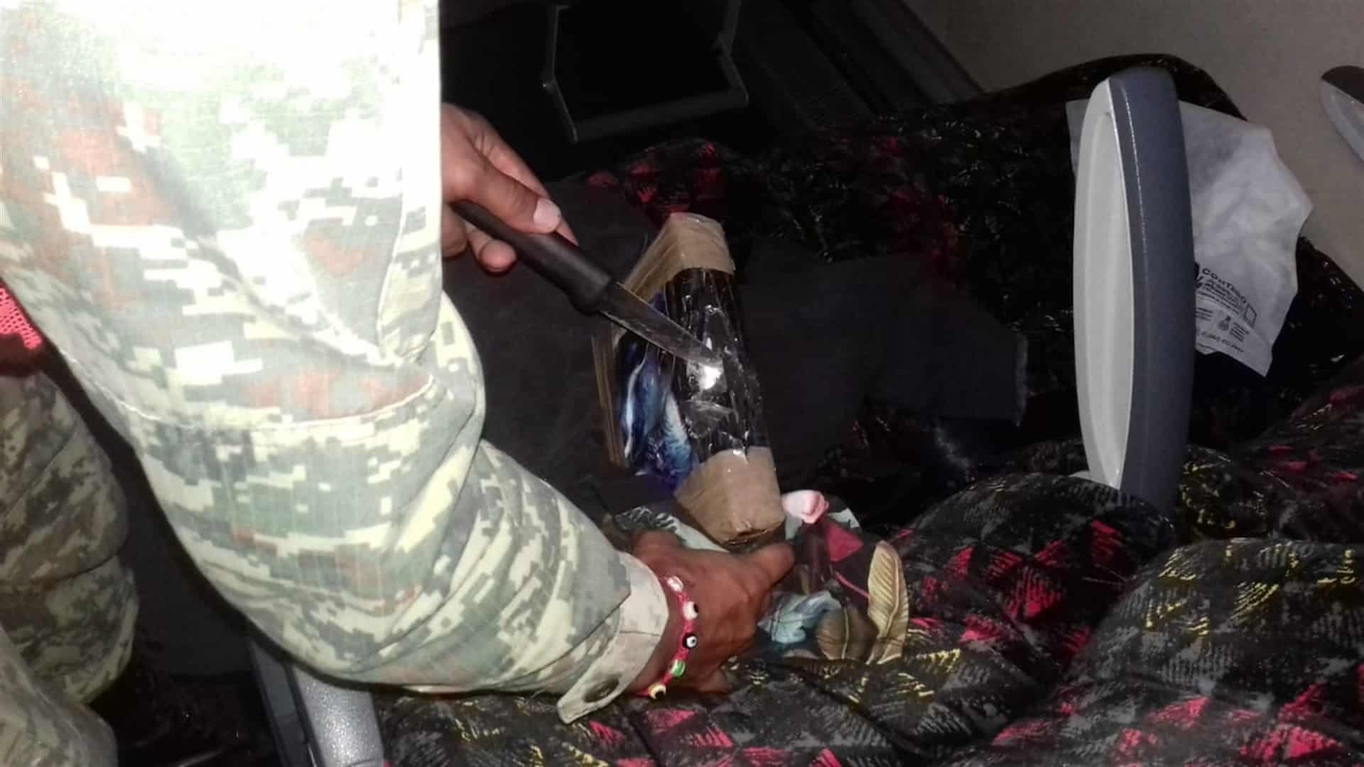 El Carrizo, Sin.- Personal de la Secretaría de la Defensa Nacional, adscritos al 89 Batallón de Infantería, aseguraron en el puesto de control militar instalado en los límites de Sinaloa con Sonora, un paquete con cocaína que iba oculta entre los asientos de un autobús de pasajeros.