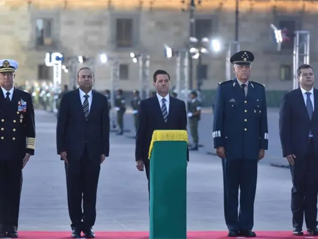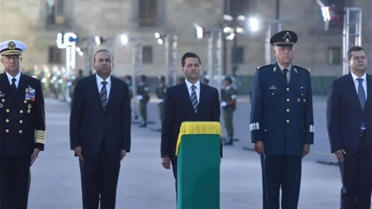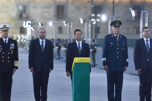 A las 6:18 horas, el primer mandatario salió de Palacio Nacional hacia el asta bandera del Zócalo capitalino, acompañado por los secretarios de Gobernación, Alfonso Navarrete Prida; de la Defensa Nacional, Salvador Cienfuegos Zepeda, y de Marina, Vidal Francisco Soberón Sanz.