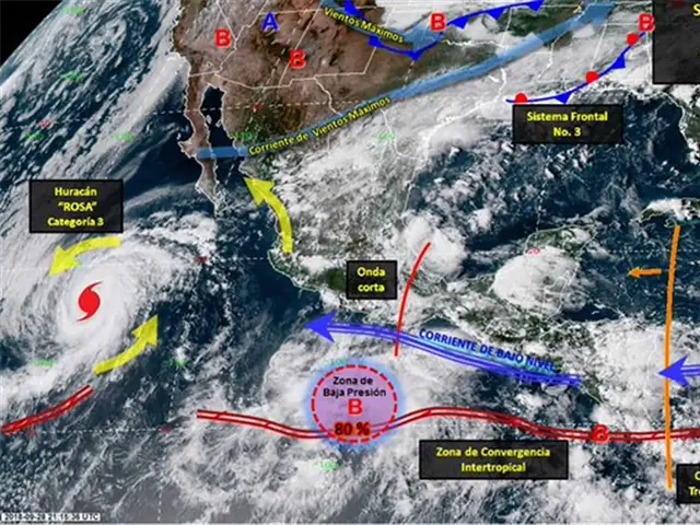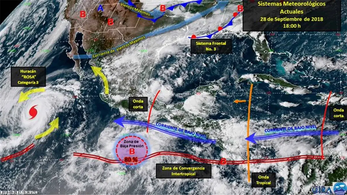 Ciudad de México.- A las 16:00 horas, tiempo del centro de México, el huracán Rosa se degradó a categoría 3 en la escala Saffir-Simpson, y estuvo ubicado aproximadamente a mil cinco kilómetros (km) al suroeste de Cabo San Lucas, Baja California Sur, con vientos de 195 kilómetros por hora (km/h), rachas de 240 km/h y desplazamiento al noroeste a 9 km/h, informó el Servicio Meteorológico Nacional (SMN), dependiente de la Comisión Nacional del Agua (Conagua).