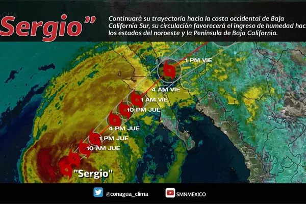 Ciudad de México.- El Servicio Meteorológico Nacional (SMN) reportó que el centro de la tormenta tropical Sergio se localizará este jueves aproximadamente a 500 kilómetros de las costas occidentales de Baja California Sur, mantendrá su trayectoria hacia dicho estado ocasionando el desarrollo de nubes de tormenta en noroeste de México.