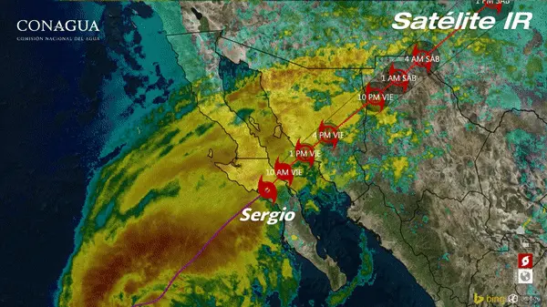El Servicio Meteorológico Nacional (SMN) precisó que a su paso originará tormentas puntuales intensas en el sur de Baja California y el norte de Baja California Sur y Sonora, tormentas muy fuertes en regiones de Chihuahua.