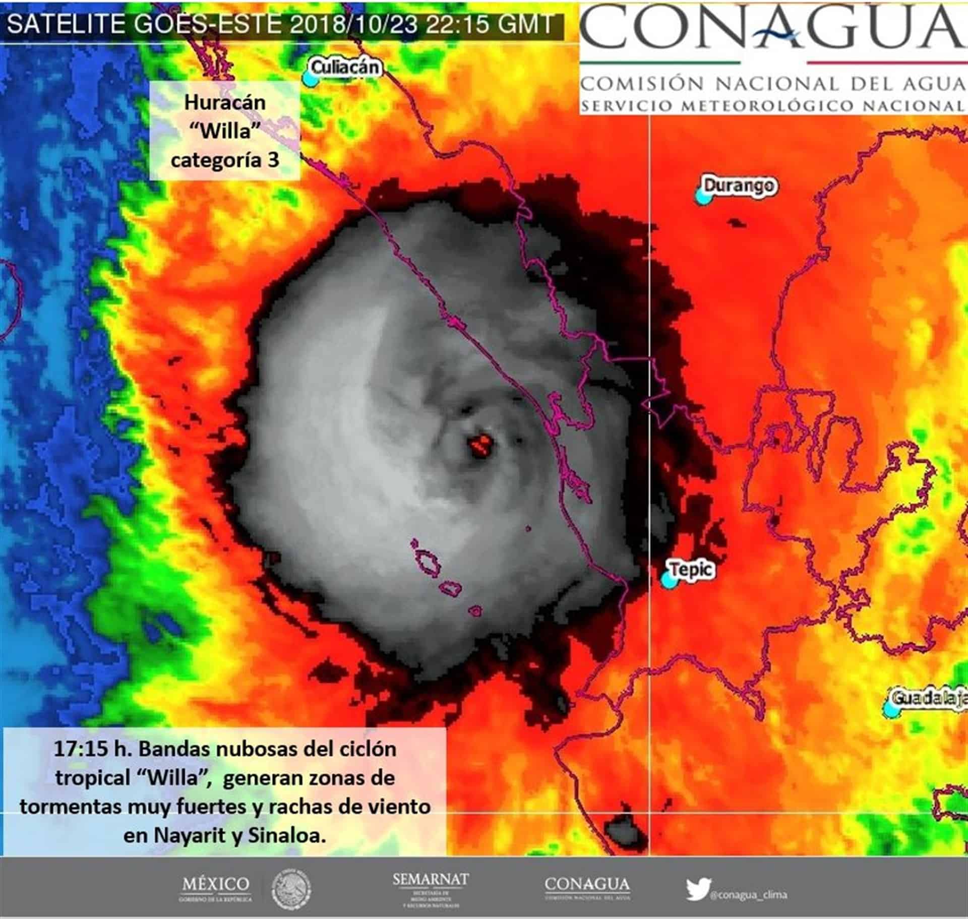 El pronóstico del Servicio Meteorológico Nacional (SMN) estimó que la "muralla delantera" de "Willa" entraría a tierra a las 17:00 del centro del país, y el ojo del huracán a las 19:00 horas.