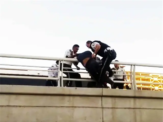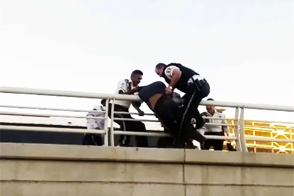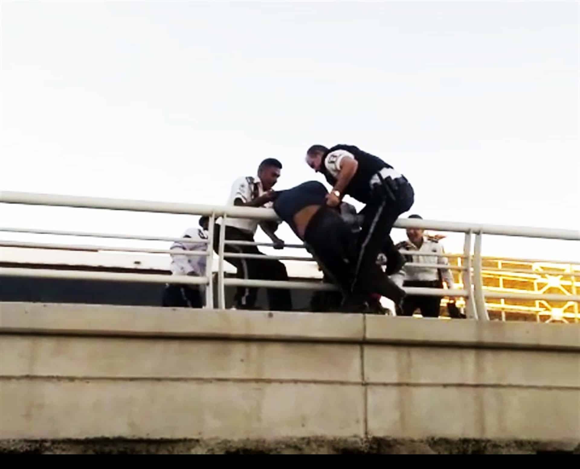 Sin pensarlo, dos de los uniformados subieron al barandal para agarrar al hombre y cruzarlo a la vialidad, mientras un tercer agente lo sujeta de las manos.