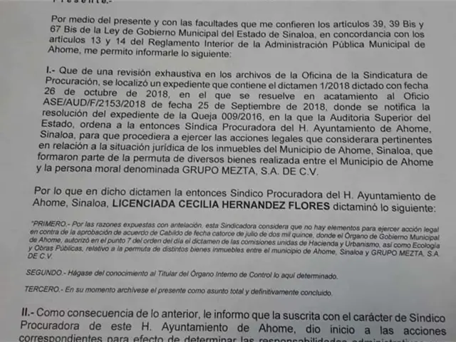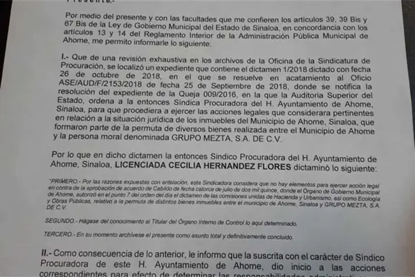 “Sale el primer dictamen que hace la Síndica Procuradora anterior, la licenciada Cecilia Hernández Flores, quien dictaminó que dice que por las razones expuestas ante las oficinas de esta sindicatura considera que no hay elementos para ejercer acción legal en contra de la aprobación del acuerdo de Cabildo con fecha 14 de julio del 2015, en el órgano de gobierno municipal de Ahome que autorizó en el punto 7 en el orden del día, el dictamen de las Comisiones Unidas de Hacienda y Urbanismo, así como Ecología y Obras Públicas, relativo a las permutas de distintos bienes inmuebles entre el municipio de Sinaloa y el grupo Mezta S.A de C.V, hágase del conocimiento al titular del Órgano Interno de Control