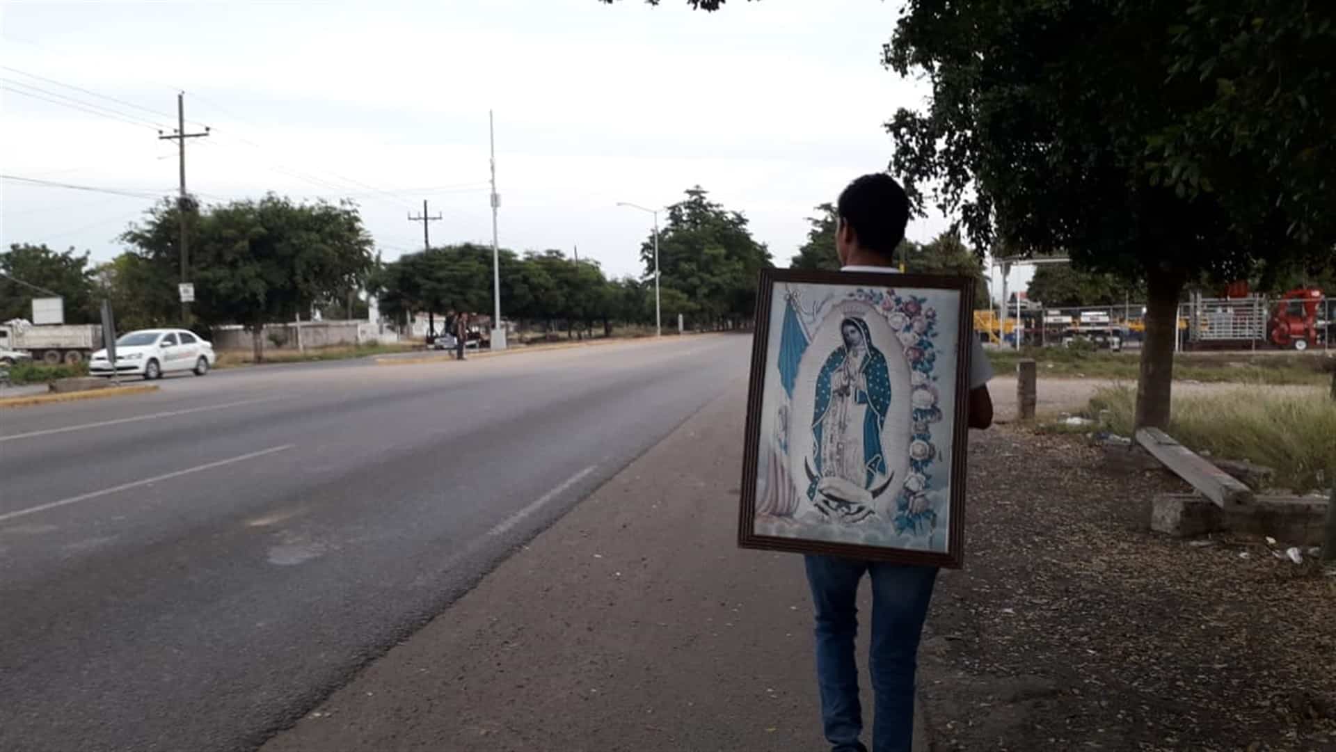 Culiacán, Sin.- Con la imagen de la Virgen de Guadalupe colgada en su espalda, Juan Rubio por segundo año consecutivo salió desde muy temprano para caminar 40 kilómetros desde la comunidad de bachimeto en el Municipio de Navolato hasta la Iglesia de nuestra señora de Guadalupe "La Lomita" situada en la capital sinaloense.