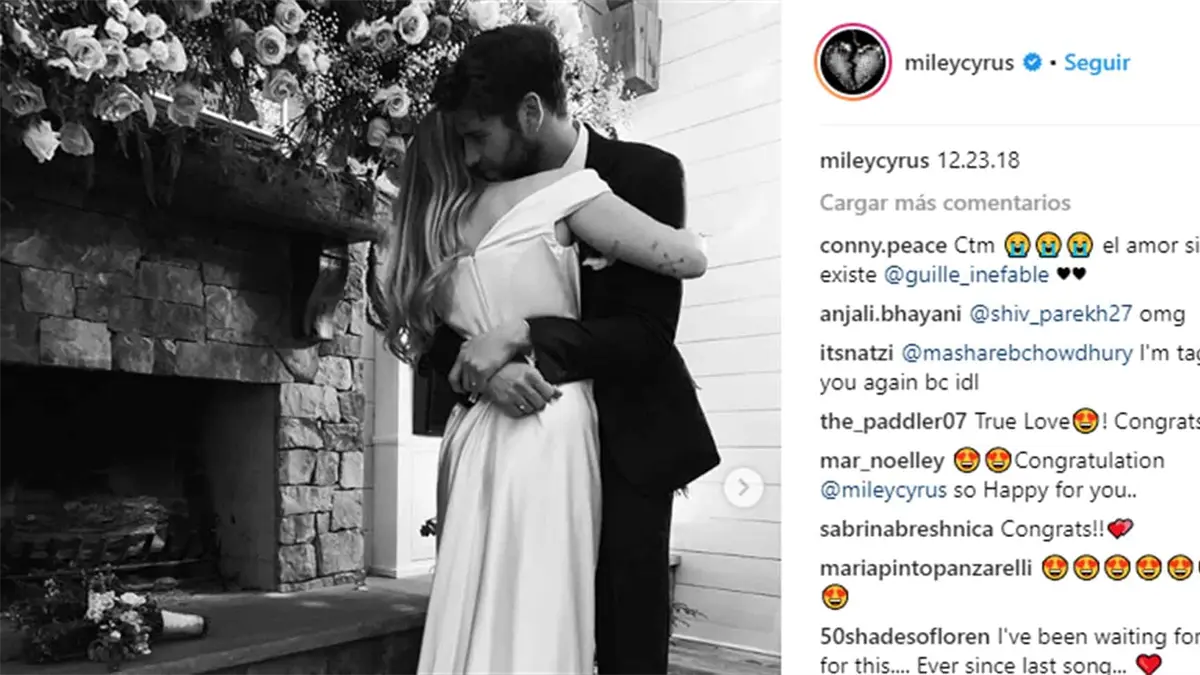 Cyrus compartió el emotivo momento con unas imágenes en las que aparece con un vestido blanco, abrazando a su ahora esposo, con un ramo al lado de la pareja.