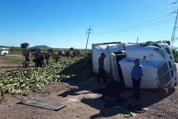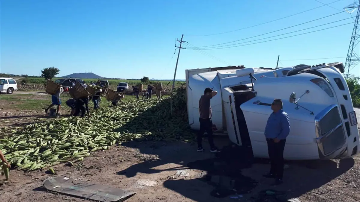 Los Mochis, Sin.- Un tractocamión cargado con 35 toneladas de elote, volcó esta tarde cuando intentaba tomar la carretera internacional México 15n en las inmediaciones del Ejido flor Azul; por fortuna el chofer resultó ileso.