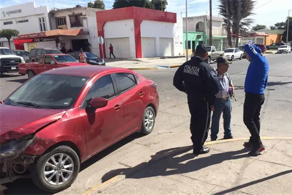 Los Mochis, Sin.- Un hombre que presuntamente no respetó su alto obligatorio, en el sector centro de Los Mochis, se impactó en su vehículo contra una patrulla de Tránsito Municipal; los agentes resultaron con lesiones menores.