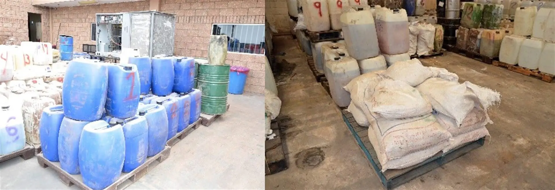 Asimismo, se destruyeron tres mil 499 litros 980 mililitros de mezcla de reacción, 379 litros 975 mililitros de 1-fenil-2-propanona, mil 107 litros 940 mililitros de acetona, mil 609 litros 999 mililitros de ácido clorhídrico, 999 litros 985 mililitros de agua, 418 litros 880 mililitros de cianuro de bencilo, mil 49 litros 996 mililitros de cianuro de sodio y 19 litros 990 mililitros de cloruro de bencilo.