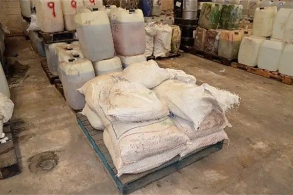 Además, mil 999 litros 990 mililitros de desechos de reacción, 599 litros 990 mililitros de metanol, 49 litros 990 mililitros de metil tiogliocolato, 17 litros 990 mililitros de mezcla de hidrocarburos y 424 litros 950 mililitros de mezcla de sustancias que contienen hidróxido de sodio y cloruro de amonio.