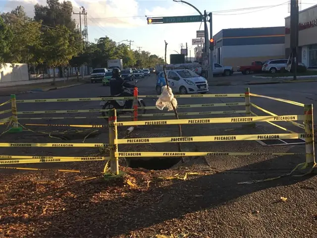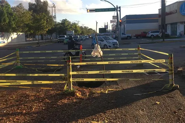Los Mochis, Sin. Con el fin de evitar un accidente automovilístico por la presencia de un socavón registrado por la avenida Degollado y bulevar 10 de Mayo, el personal del área operativa de la Junta de Agua Potable y Alcantarillado del Municipio de Ahome (JAPAMA) delimitan más el área con material preventivo y cierran el carril que va de norte a sur.