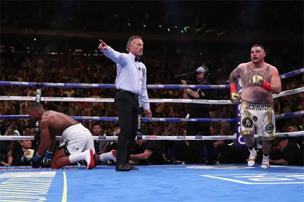 Joshua se levanta con problemas, se nota muy golpeado y se sostiene en las cuerdas, mientras escucha el conteo de protección del referee.