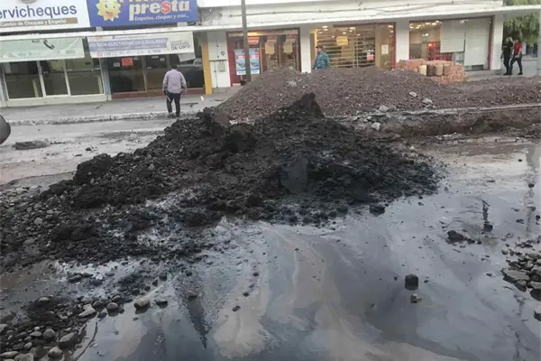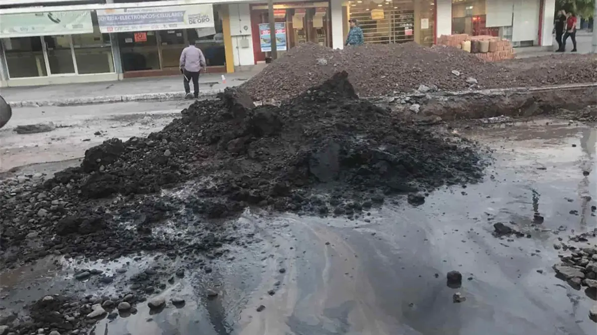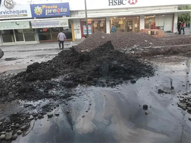 Y es que mientras realizaban las excavaciones para la colocación de tuberías, en la esquina de las avenidas Gabriel Leyva e Independencia, percibieron un fuerte olor a combustible, en el agua que brotaba de la misma perforación.