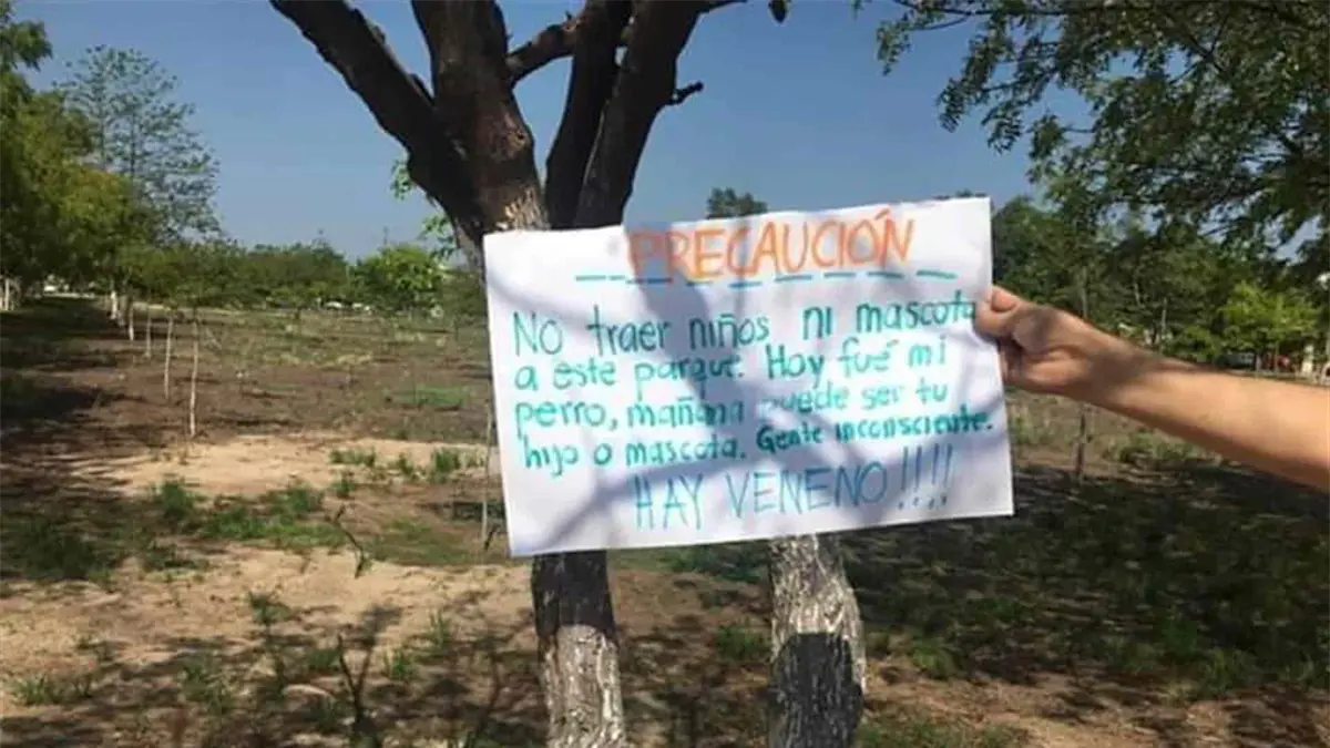 Precaución, no traer niños, ni mascotas a este parque. Hoy fue mi perro, mañana puede ser tu hijo o mascota. Gente inconsciente ¡Hay veneno!