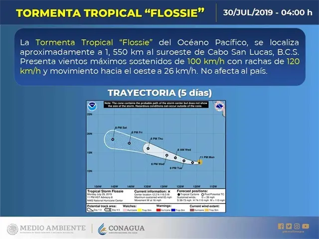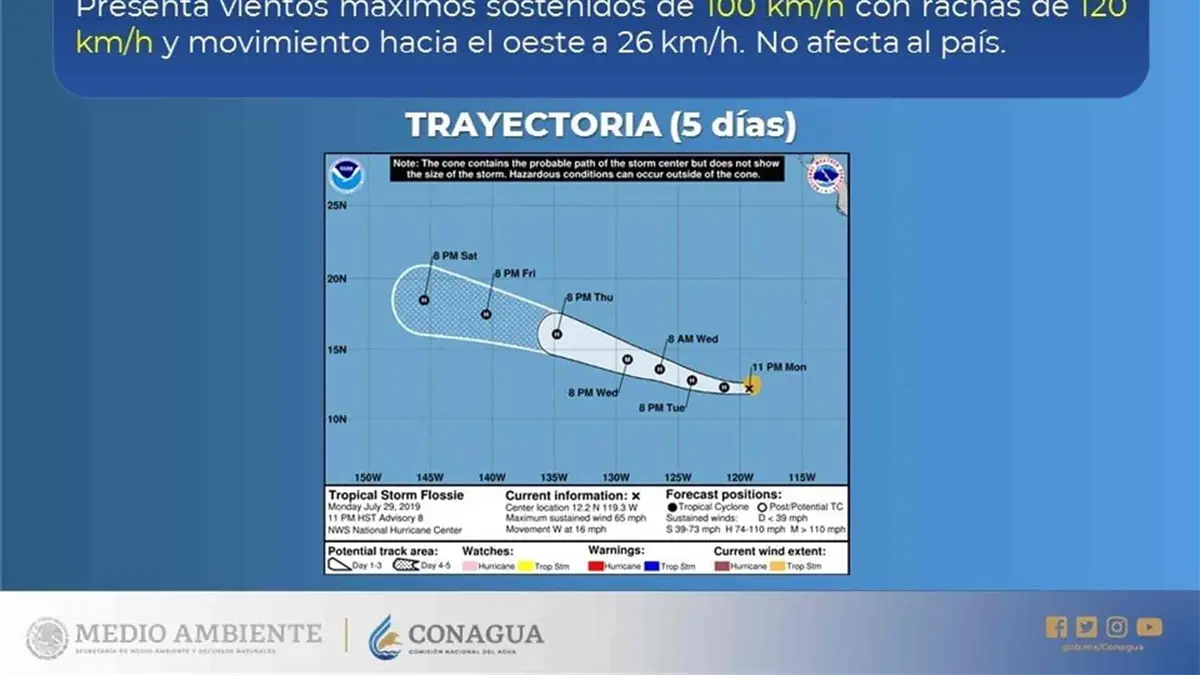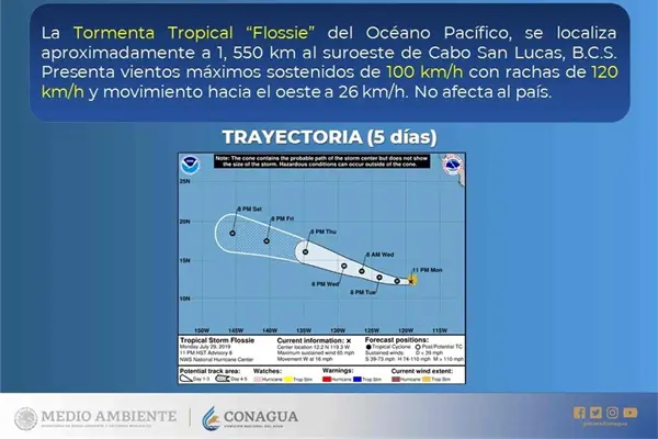 Ciudad de México.- El Servicio Meteorológico Nacional (SMN) informó que la tormenta tropical Flossie intensifica gradualmente la velocidad de sus vientos mientras se aleja de costas nacionales.