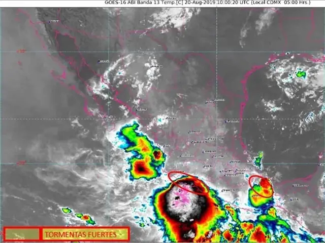 El sistema origina lluvias muy fuertes a puntuales torrenciales con descargas eléctricas sobre el sur y sureste de México.