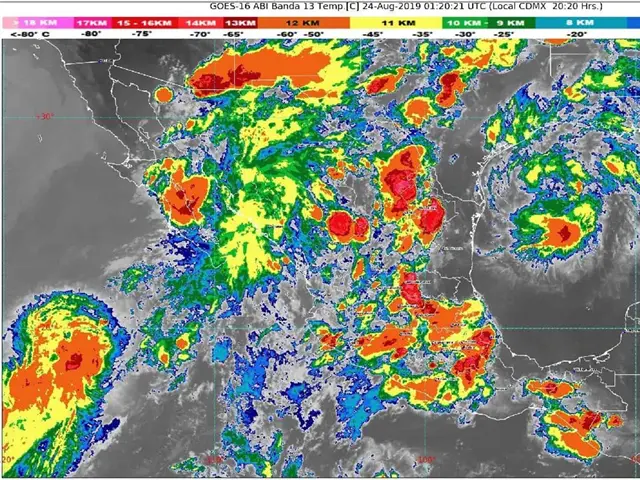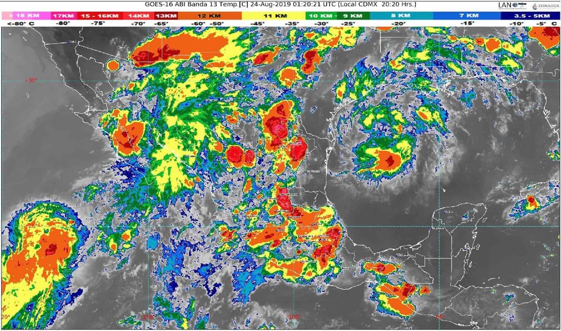 Se prevén lluvias muy fuertes en Baja California Sur, Sonora, Chihuahua, Durango y Sinaloa; fuertes en Baja California, Coahuila, Nuevo León, Tamaulipas, Zacatecas, San Luis Potosí, Aguascalientes, Nayarit, Jalisco, Colima, Michoacán, Guanajuato, Estado de México, Ciudad de México, Hidalgo, Querétaro, Tlaxcala, Morelos y Puebla; chubascos en Guerrero, Oaxaca, Veracruz y Chiapas, y lluvias aisladas en Tabasco, Campeche, Yucatán y Quintana Roo, debido a los fenómenos meteorológicos mencionados.