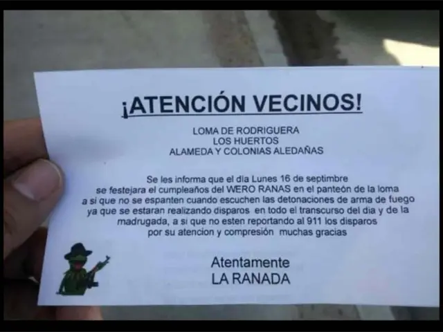 ¡Atención vecinos! Loma de Rodriguera, Los Huertos, Alameda y Colonias Aledañas. Se les informa que el día lunes 16 de septiembre se festejará el cumpleaños del Wero Ranas en el panteón de la Loma, así que no se espanten cuando escuchen detonaciones de arma de fuego ya que se estarán realizando disparos en todo el transcurso de día y de la madrugada, así que no estén reportando al 911 los disparos. Por su atención y comprensión muchas gracias. Atentamente La Ranada.