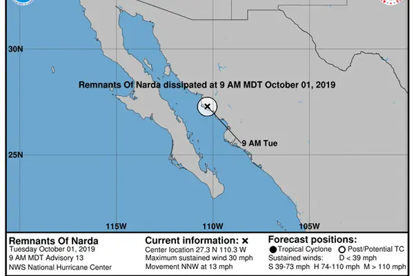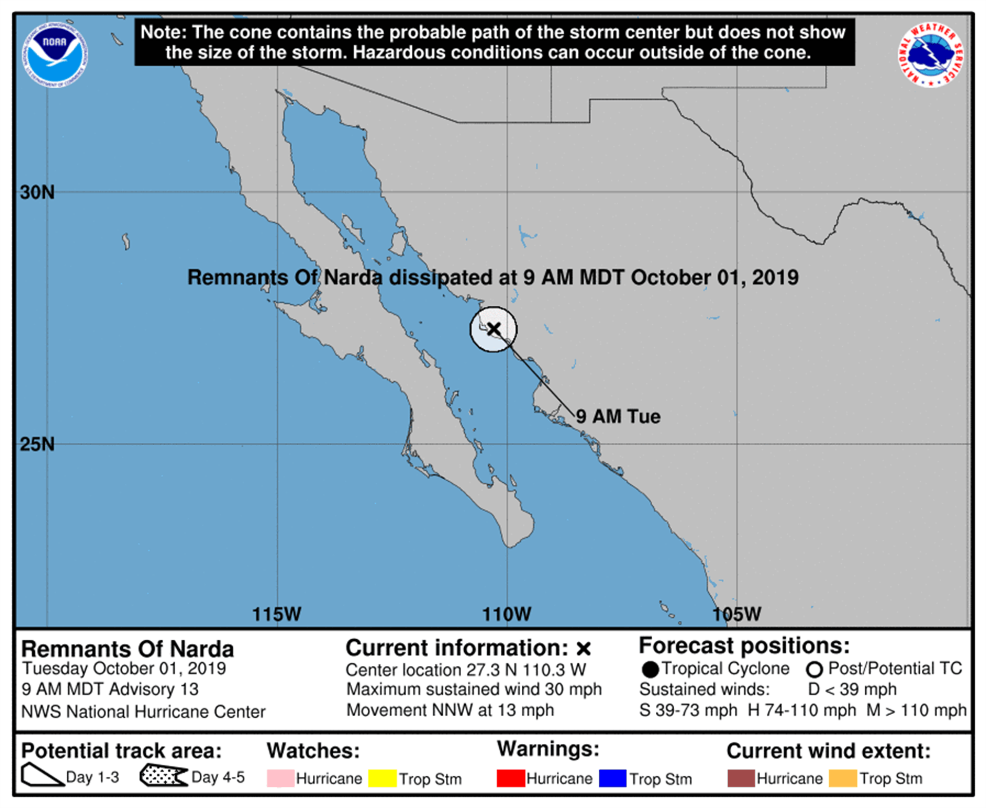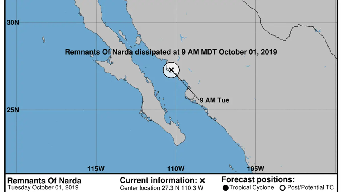 Miami.- A partir de las 9:00 horas los remanentes de "Narda" se encuentran a unos 130 kilómetros (210 km) al noroeste de Los Mochis, México, según el Centro de Huracanes de Miami.