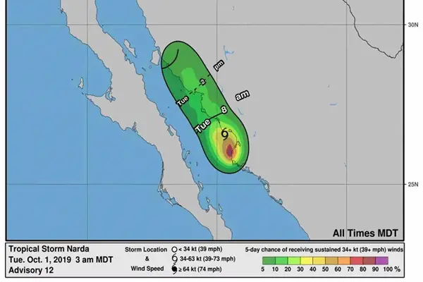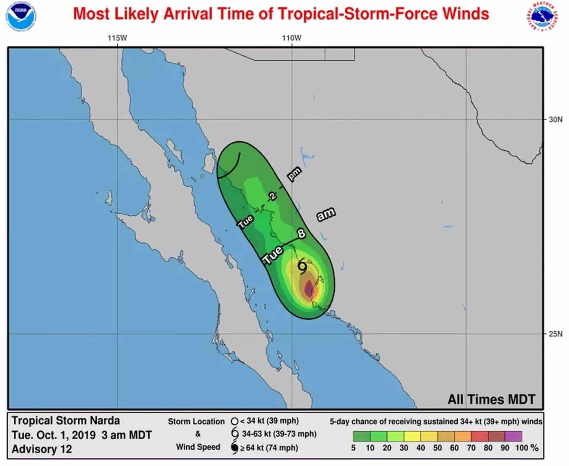 Miami.- A las 3 a.m. MDT, el centro de la tormenta tropical Narda estaba cerca de la costa oeste de México, a unas 70 millas (115 km) al noroeste de Los Mochis y a unas 120 millas (195 km) al sureste de Guaymas.