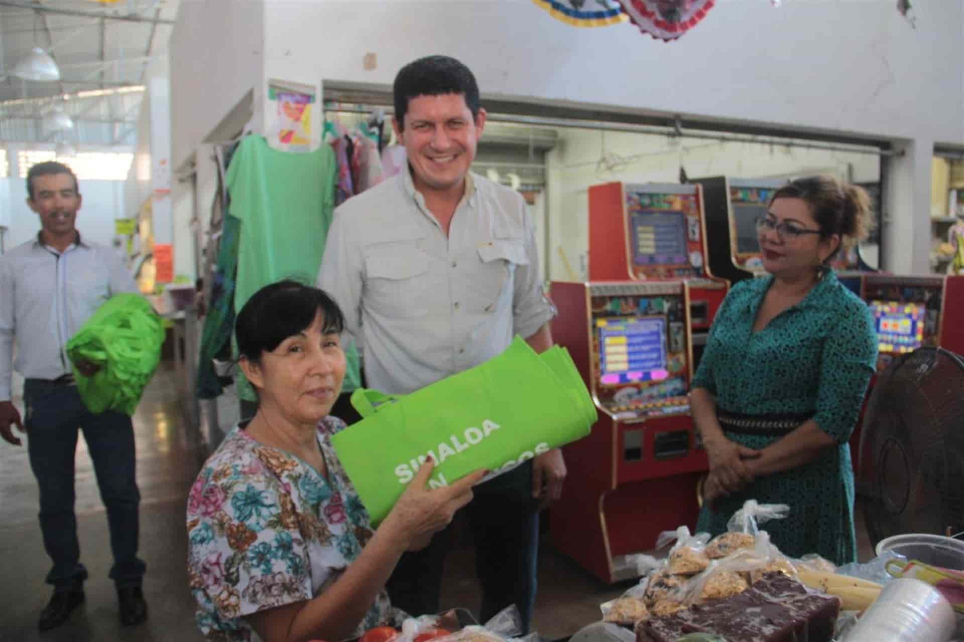 El titular de la Sedesu platicó con los ciudadanos que acuden a este punto comercial del municipio y los invitó a sustituir las llamadas bolsas de camiseta por las de tela; a los locatarios les recomendó las opciones biodegradables para que contribuyan a disminuir el número de plásticos de un solo uso que se acumulan en las 3 mil toneladas de basura diaria que se generan en Sinaloa.
