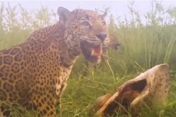 Una mañana después, los restos de la tortuga ya no estaban, por lo que se revisaron las cámaras trampa y en las fotos y video se pudo observar a dos ejemplares de jaguar alimentándose.