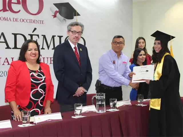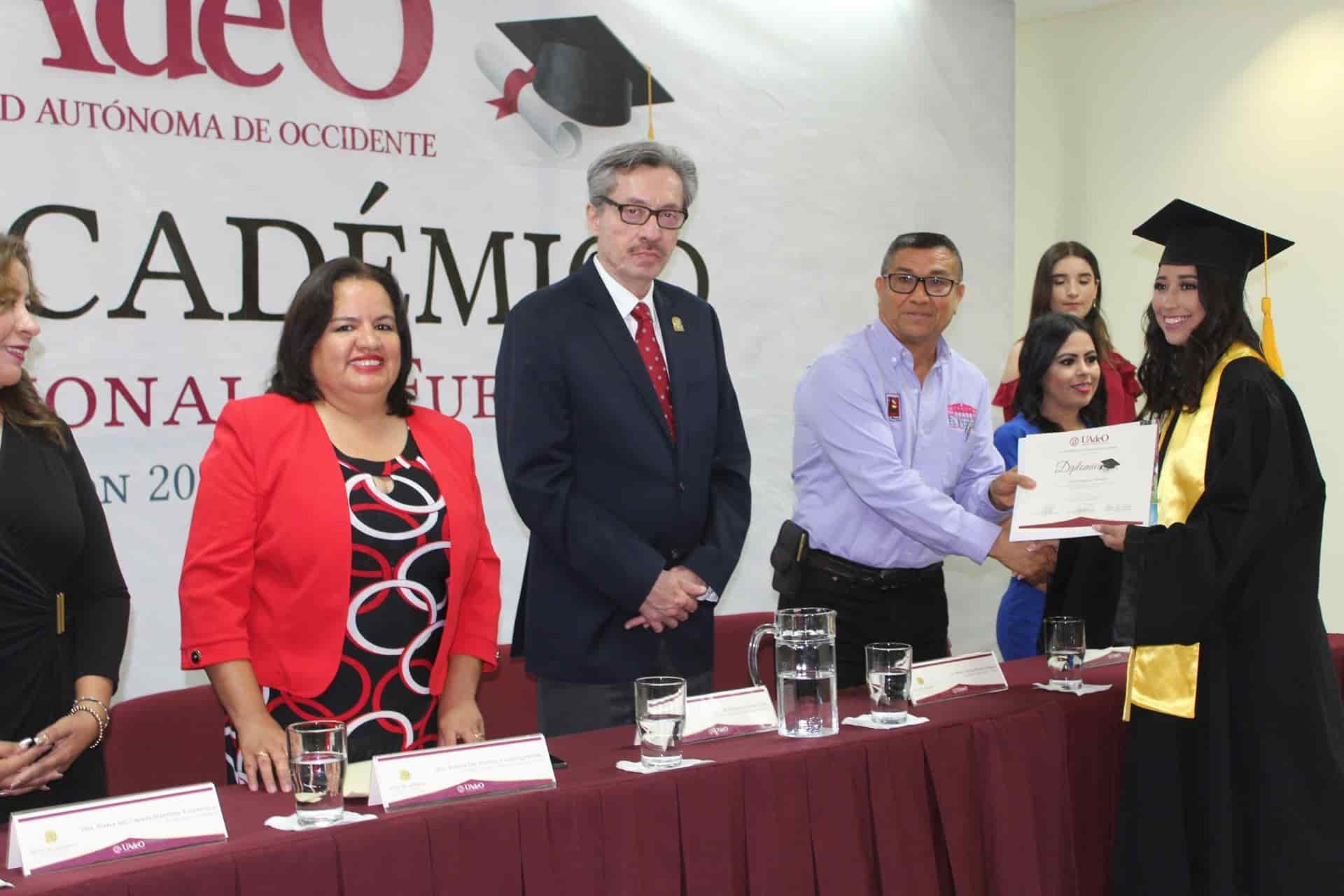 El Fuerte, Sin.- Como parte del ciclo de desarrollo profesional, 56 alumnos de la Universidad Autónoma de Occidente (UAdeO) Unidad Regional El Fuerte, correspondientes a los Programas Educativos de Licenciatura en Derecho y Ciencias Sociales, Administración de Empresas y Psicología que dieron por concluida su formación en las aulas de los cuales 19 de los nuevos egresados recibieron la titulación automática.