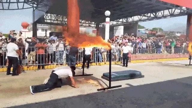 El elemento de la Secretaría de Seguridad Pública de Cunduacán debía atravesar una barra en llamas con el impulso de un brinco sobre las espaldas de dos compañeros, pero en el intento falló y fue a dar contra el fuego.