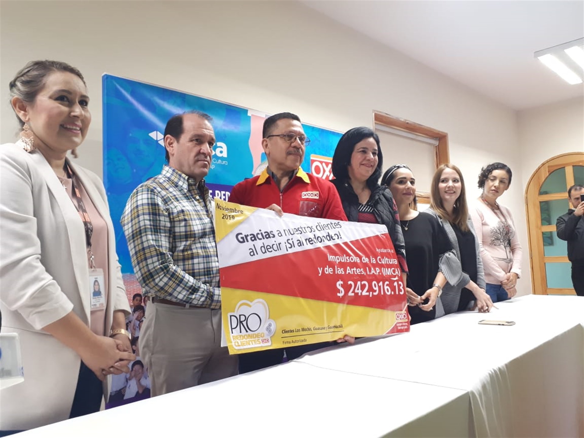 Los Mochis, Sin.- Impulsora de la Cultura y las Artes I. A. P. recibió este jueves por parte de tiendas Oxxo el donativo del redondeo, de un total de 242 mil 916 pesos con 13 centavos, recurso recaudado de los meses de septiembre y octubre.