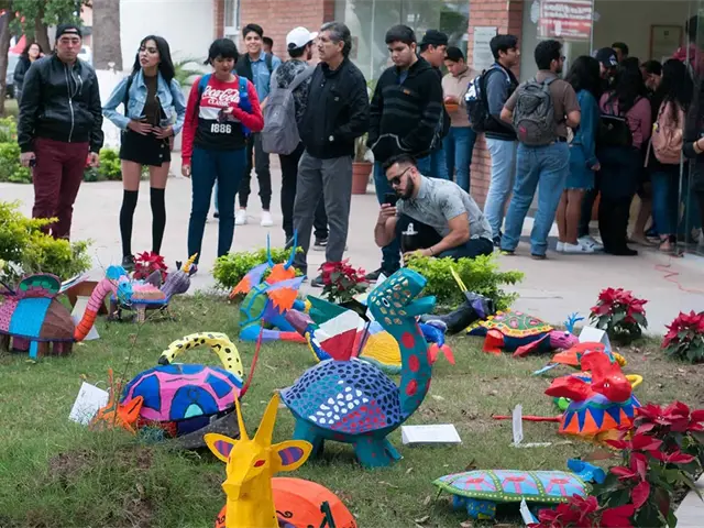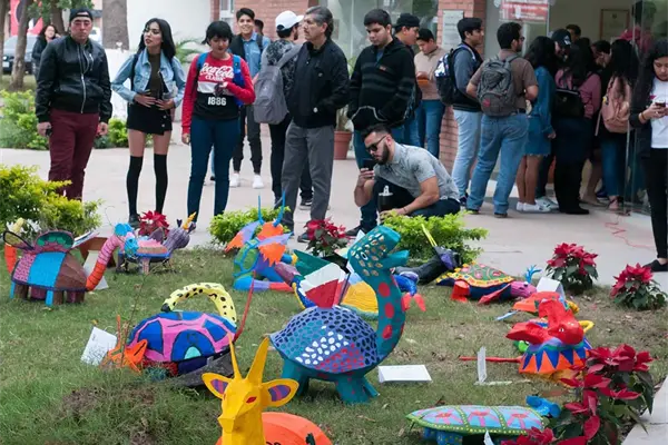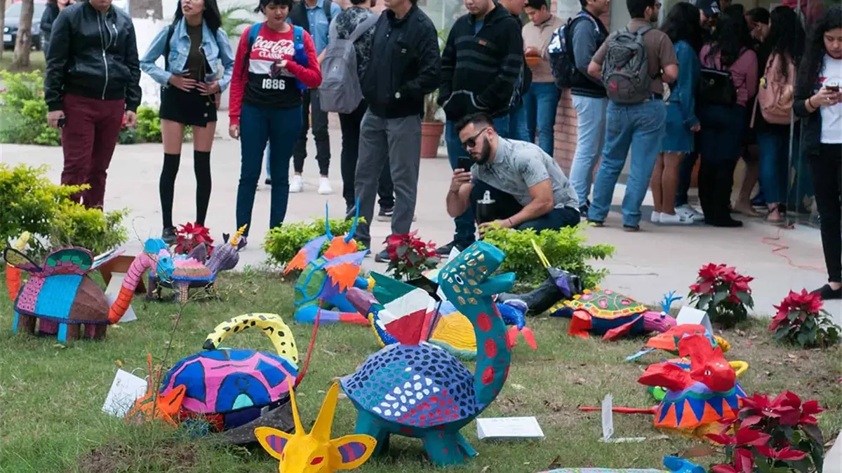 Los Mochis, Sin.- Los jardines de la Biblioteca Pública Morelos se llenaron de color y el talento de los estudiantes del primer semestre de la licenciatura en Diseño Gráfico Empresarial, UANEG, UAS con la creativa exposición de alebrijes “Los Mochis, tierra de magia y tortugas”.