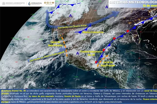 Un canal de baja presión se extenderá sobre el sur del Golfo de México, originando potencial de lluvias en el sureste de la República y Península de Yucatán, así como vientos del norte con rachas superiores a 60 km/h en el Istmo y Golfo de Tehuantepec.