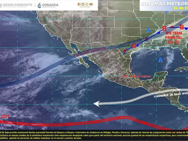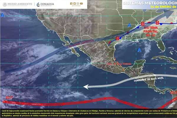 Ciudad de México.- Este día, un canal de baja presión en el suroeste del Golfo de México y sureste de México ocasionará lluvias puntuales fuertes en Oaxaca y Chiapas e intervalos de chubascos en Hidalgo, Puebla y Veracruz, además de vientos de componente norte con rachas de 70 km/h en el Istmo y Golfo de Tehuantepec. Así mismo, una circulación anticiclónica en niveles medios de la atmósfera mantendrá cielo mayormente despejado sobre gran parte del territorio nacional; ascenso gradual de las temperaturas vespertinas, pero conservando ambiente frío por la mañana en zonas del interior de la República, además de presencia de nieblas matutinas en el noreste y oriente del país.