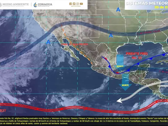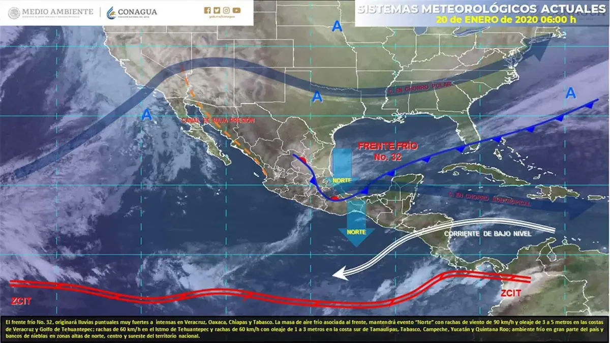 El Servicio Meteorológico Nacional destacó que el frente frío No. 32 se extenderá sobre la Península de Yucatán y el sureste de México, originando lluvias puntuales muy fuertes a intensas en Veracruz, Oaxaca, Chiapas y Tabasco.