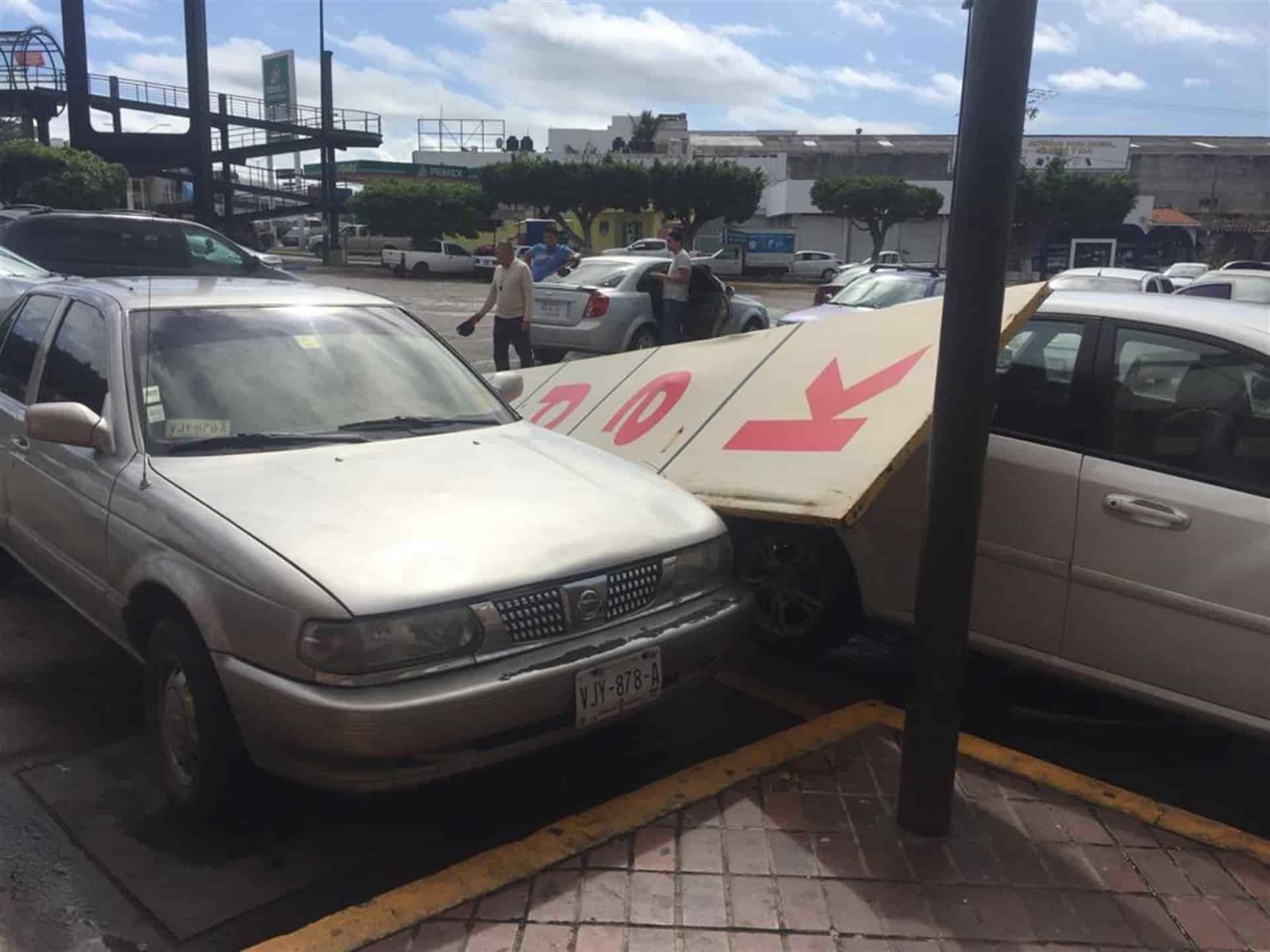 Mazatlán, Sin.- Un anuncio espectacular cayó sobre dos vehículos al no resistir el viento fuerte registrado esta mañana, en un percance registrado en el estacionamiento de un centro comercial de Mazatlán.