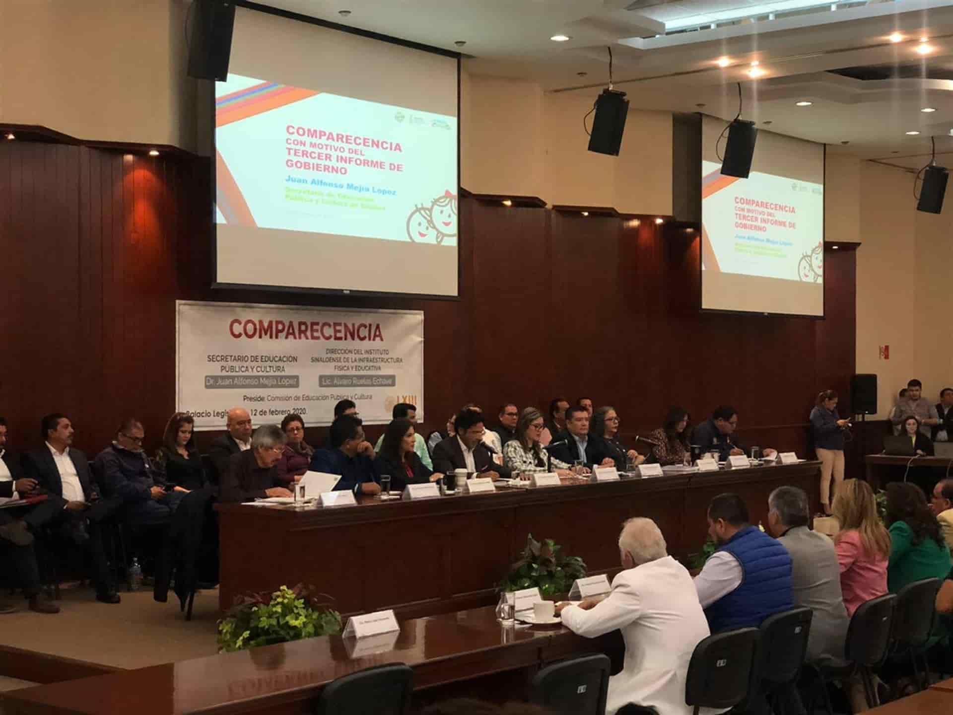 Culiacán, Sin.- Diputados del Congreso del Estado, aprovecharon la comparecencia del Secretario de Educación Pública y Cultura, Juan Alfonso Mejía López, para señalarle las deficiencias que todavía existen en el área educativa, pues si bien, hay mejora para los estudiantes, explicaron que las condiciones laborales en las que vive el personal docente es carente.