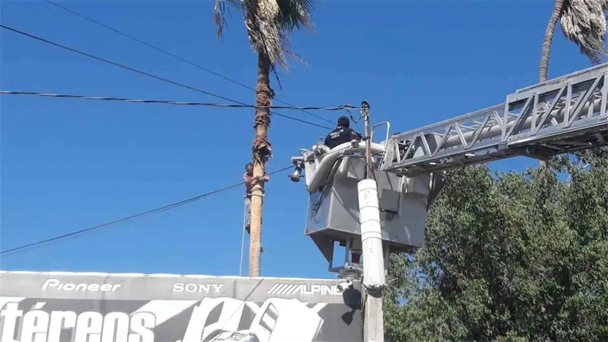 Los Mochis, Sin.- Una llamada al servicio de emergencias 911, causó la movilización de los cuerpos de auxilio, luego de que un hombre terminara colgado de poco más de 10 metros de altura, al caerle una hoja de una palmera que podaba esta tarde, en la colonia La Cuchilla de Los Mochis.