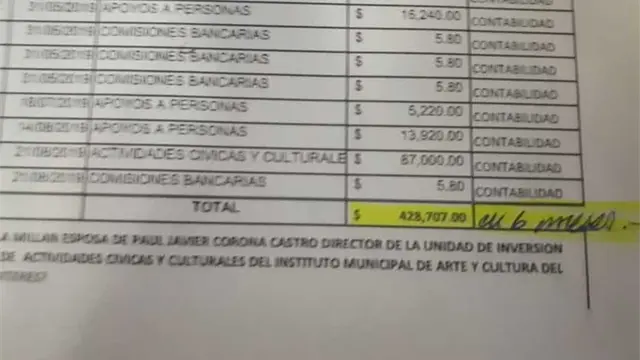 Además, durante la rueda de prensa a la que convocaron los integrantes de Vigilantes Ciudadanos por la Transparencia en Sinaloa se dio a conocer que el área de contabilidad del Instituto Municipal de Arte y Cultura (IMAC) tuvo una erogación de 428 mil 707 pesos de marzo a septiembre del 2019 a beneficio de José Fidel Millán Chávez, hermano de la esposa del Director de la Unidad de Inversión del Ayuntamiento de Ahome.