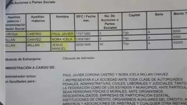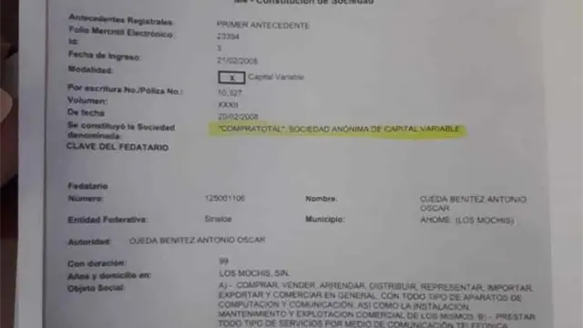 “Se verificó solicitando al SAT la constancia de situación fiscal que es un documento oficial y esta hace constar que el teléfono dado de alta es el: 6681... (se omite) y su propietaria es la esposa de Paúl Corona; el correo de alta es contabilidad@compratotal.com.mx; y esta empresa está registrada, según la constancia del Registro Público de Comercio como Compratotal S. A. Y pertenece a Paúl Javier Corona Castro; su esposa, Nora Icela Millán Chávez y su suegro, Jesús Manuel Millán Millán. Se anexa cédula de identificación fiscal de María del Carmen Guerrero Godoy y constitución de sociedad del registro público de comercio de Compratotal S. A de C. V”, detalló Padilla Montiel.
