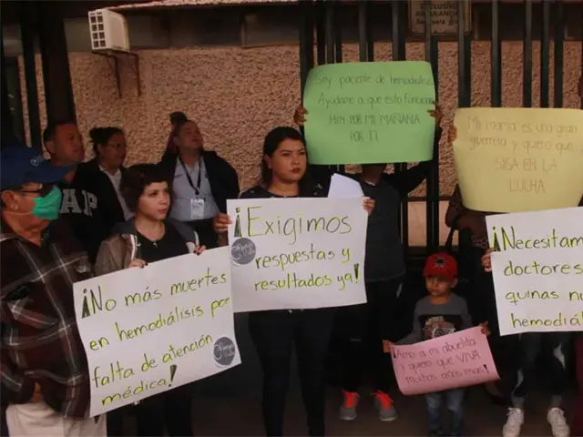 Acompañados por su familia, pacientes de hemodiálisis protestan y piden más máquinas para mejor atención en la clínica 49 del IMSS.