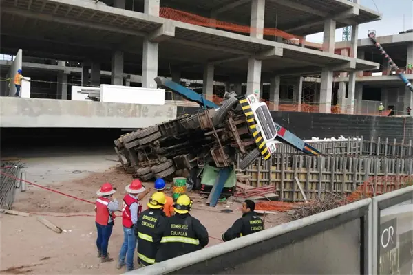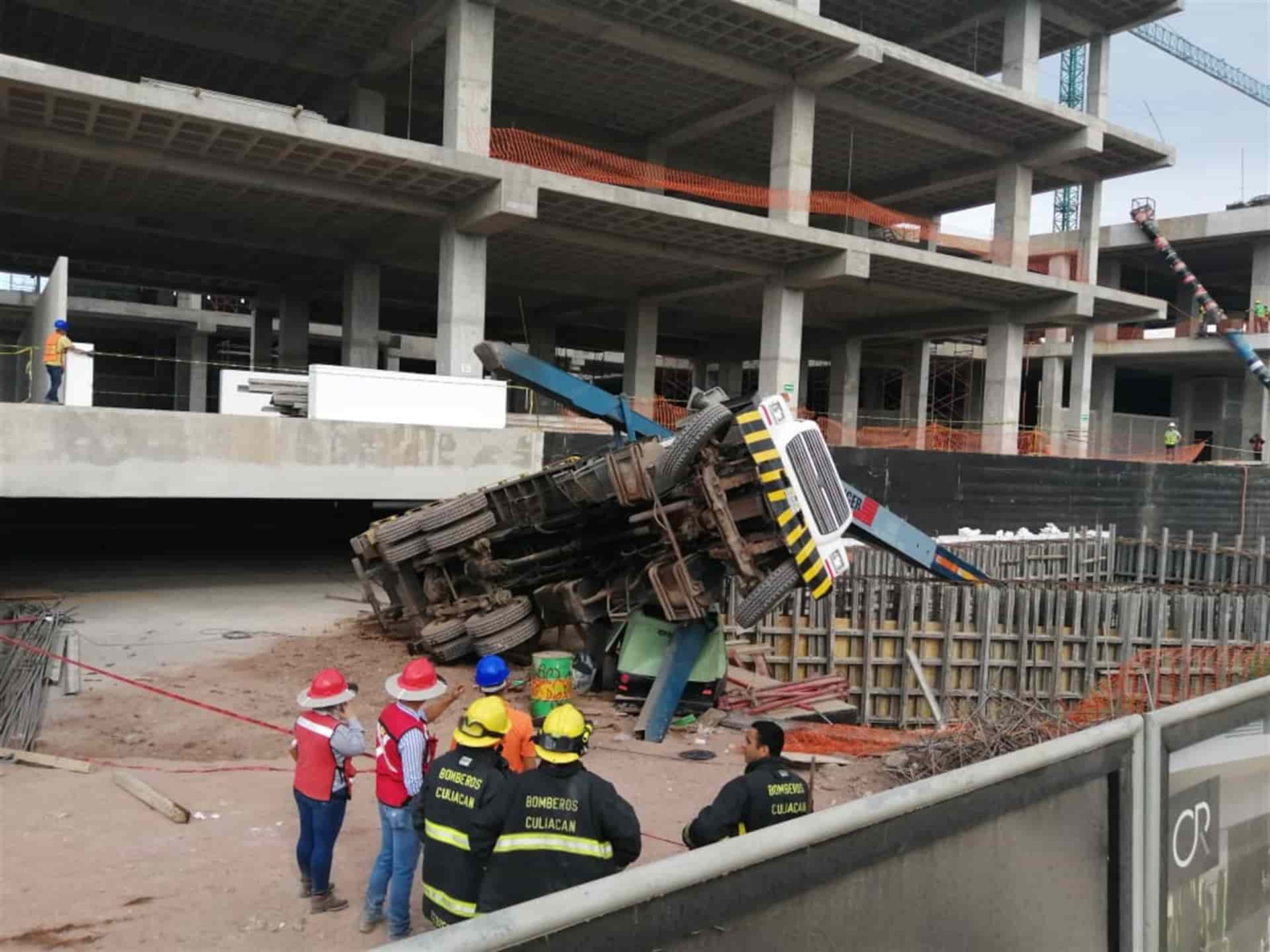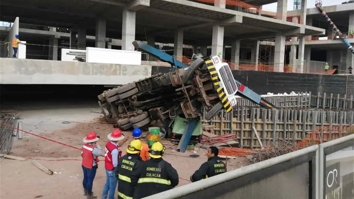 Vuelca grúa tras maniobras en plaza de Culiacán