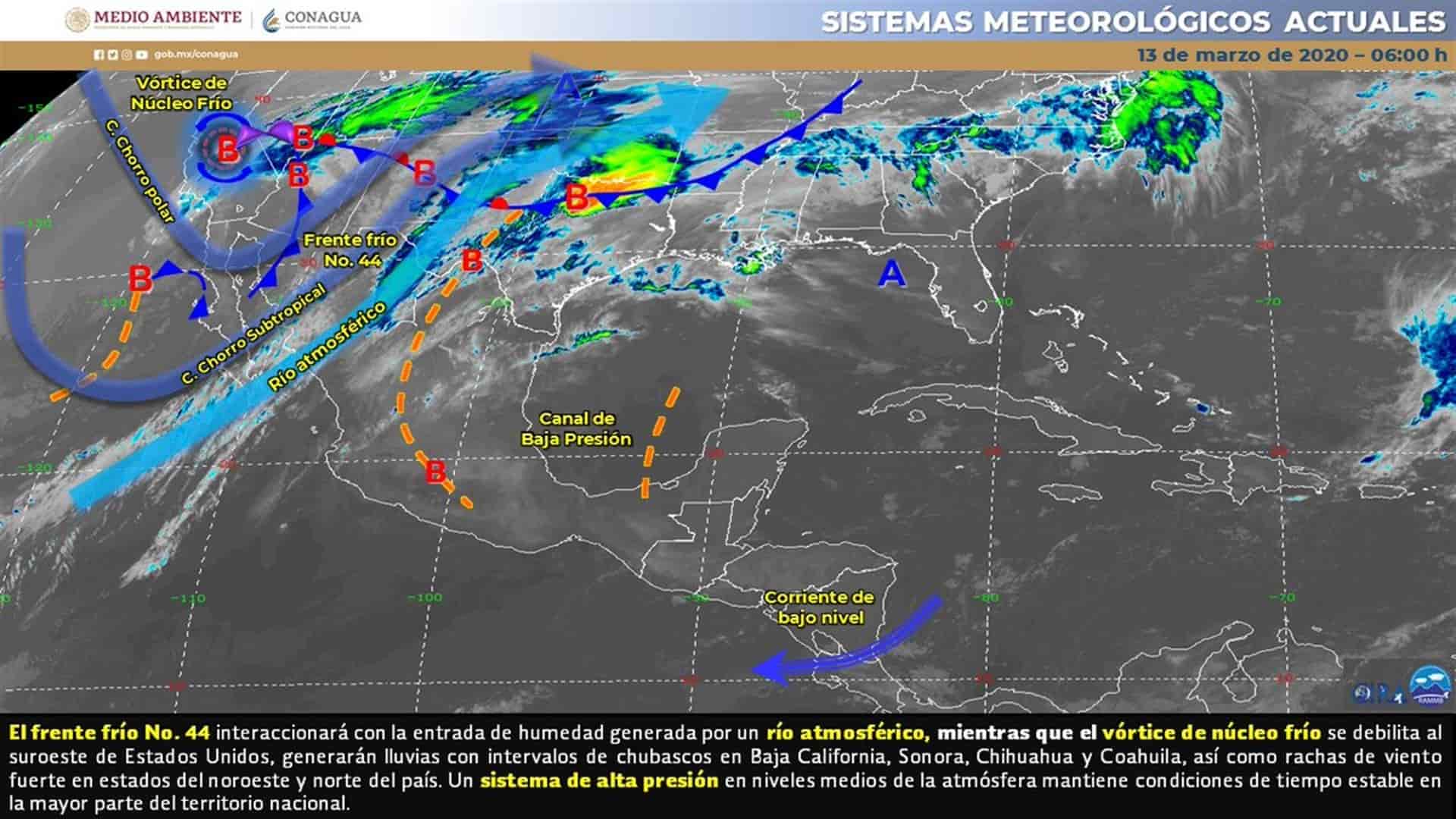 Ciudad de México.- Para hoy, el frente frío No. 44 se extenderá sobre Chihuahua y Sonora, interaccionará con la entrada de humedad proveniente del Océano Pacífico generada por un río atmosférico, dichos sistemas ocasionarán lluvias con intervalos de chubascos en Baja California, Sonora, Chihuahua y Coahuila, así como rachas fuertes de viento en estados del noroeste y norte del país, mientras que el vórtice de núcleo frío se debilitará en el suroeste de Estados Unidos.