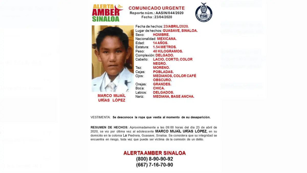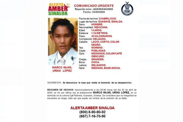 Se trata de Marco Mijaíl Urías López, de 14 años de edad, con domicilio en la colonia La Piedrera, de la ciudad de Guasave.