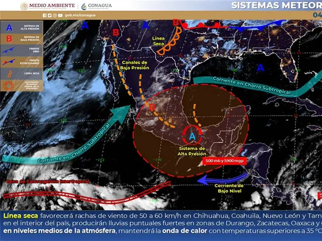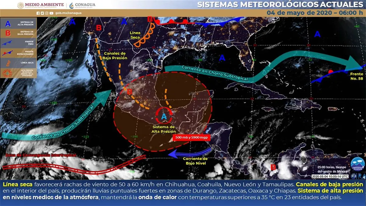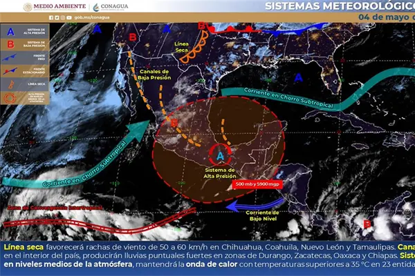 Durante la tarde, canales de baja presión en el interior del país, asociados con divergencia en altura, producirán el desarrollo de nublados y lluvias puntuales fuertes en zonas de Durango, Zacatecas, Oaxaca y Chiapas. Finalmente, un sistema de alta presión en niveles medios de la atmósfera, mantendrá la onda de calor con temperaturas superiores a 35 °C en 23 entidades de la República Mexicana.