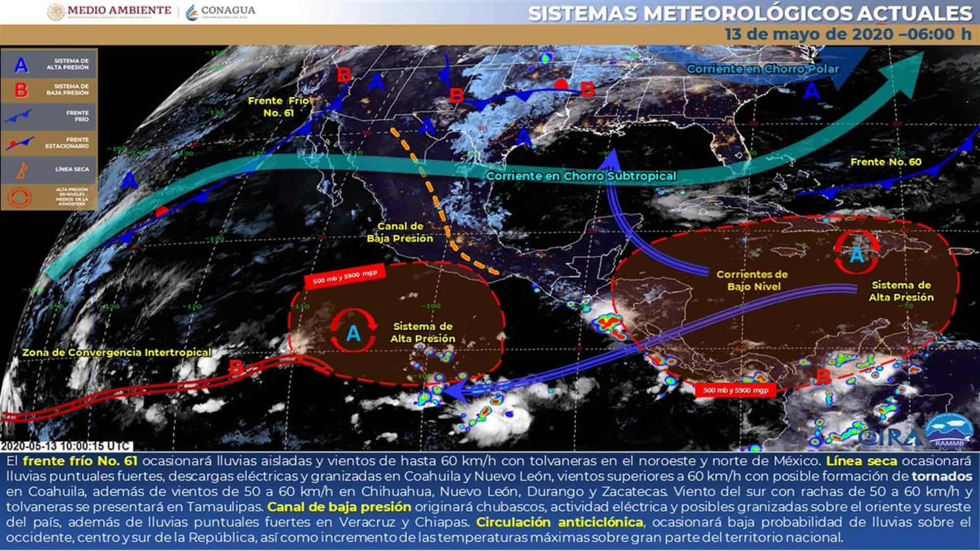 Una línea seca se ubicará sobre Coahuila y en interacción con divergencia en altura, ocasionará chubascos y lluvias puntuales fuertes acompañadas de descargas eléctricas y granizadas sobre Coahuila, Nuevo León y Tamaulipas, rachas de viento superiores a 60 km/h con posible formación de tornados en Coahuila, así como rachas de 50 a 60 km/h en Chihuahua, Nuevo León, Durango y Zacatecas.