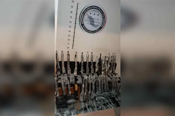 A los imputados les aseguraron 32 armas: 17 rifles AK-47 de los llamados “cuernos de chivo”, calibre 7.62 × 39, seis ametralladoras calibre 5.56 mm, y nueve calibre .300 mm Winchester Magnum. Además 32 cargadores: 17 para acá 47 seis para ametralladora 5.56 mm y nueve más calibre .300mm de largo alcance.